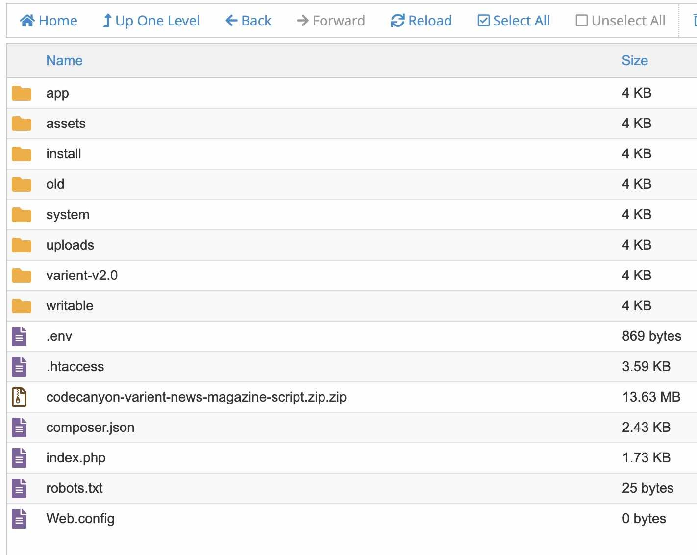 Delete unnecessary files/folders: "documentation", "uploads", "varient-v..", "install" and "codecanyon-varient-news-magazine-script.zip".