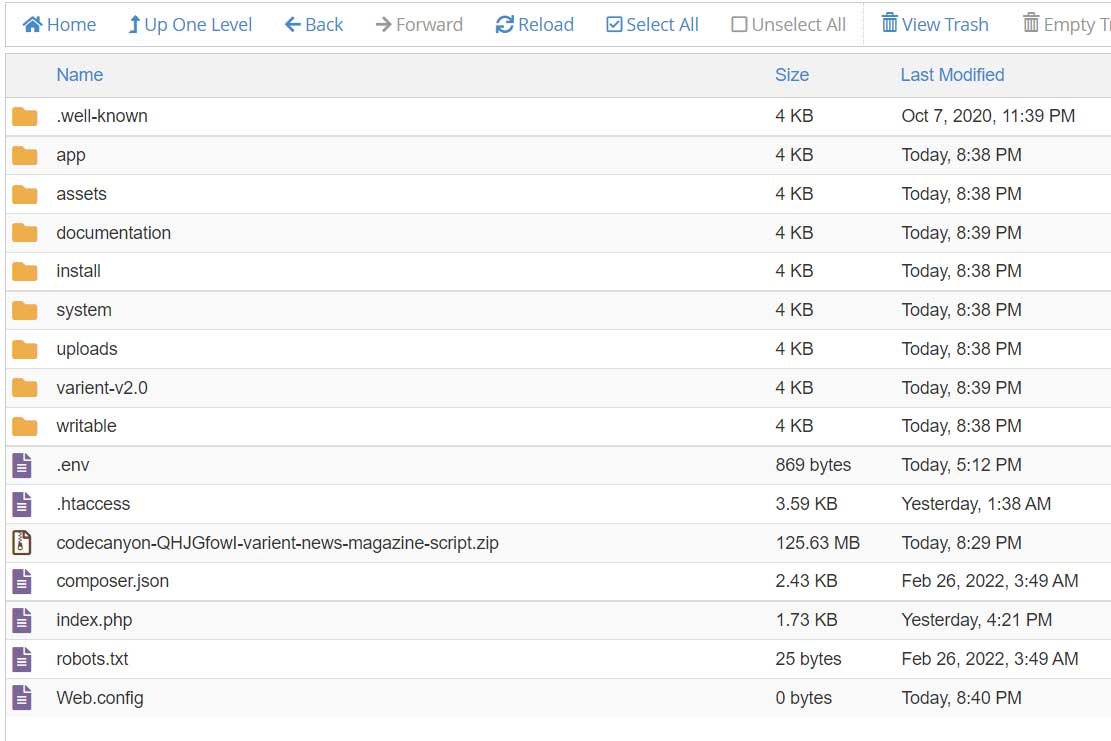 Delete unnecessary files/folders: "documentation", "uploads", "varient-v..", "install" and "codecanyon-varient-news-magazine-script.zip".